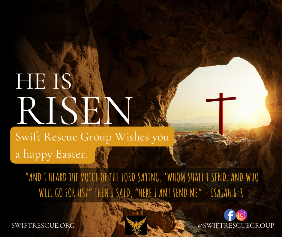 Swift Rescue Group was created to impact those affected by natural disasters, missing persons, or poverty. Through providing this service, our main mission is to spread the Word of God. Using our skills and abilities to make a physical impact in people’s lives makes a short-term effect, but our goal through those physical interactions is to make a lasting impact through sharing God’s Word. This Easter take the time to remember the sacrifice Jesus made in giving His life so that we have the opportunity to gain everlasting life through Him.